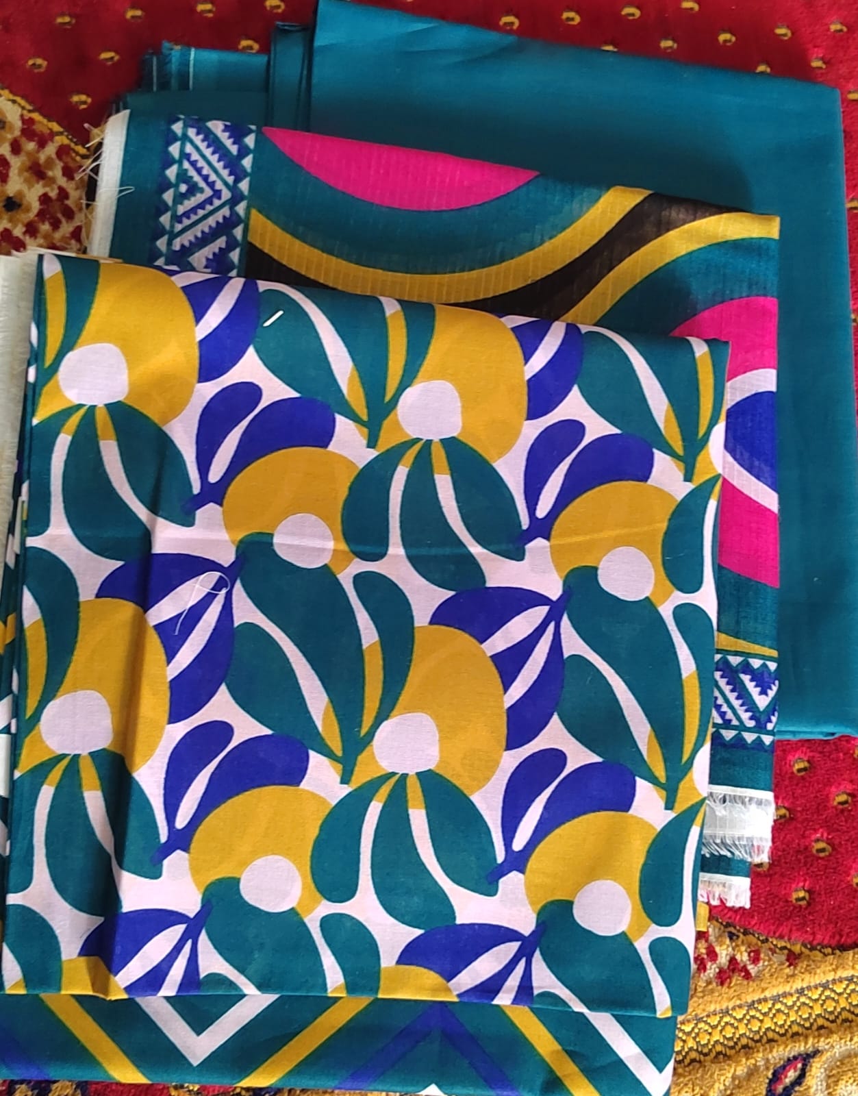 This eye-catching ensemble features a lively blue, yellow, and green abstract leaf print on the shirt, crafted from breathable Printed Premium Lawn. It is perfectly paired with a boldly patterned, matching printed slub voile dupatta featuring striking circular motifs. To complete the look, it comes with a soft, solid turquoise Premium Dyed Cambric Cotton trouser. Because it is completely unstitched, you have the creative freedom to style it exactly how you want—perhaps with chic wide-leg trousers just like the model!