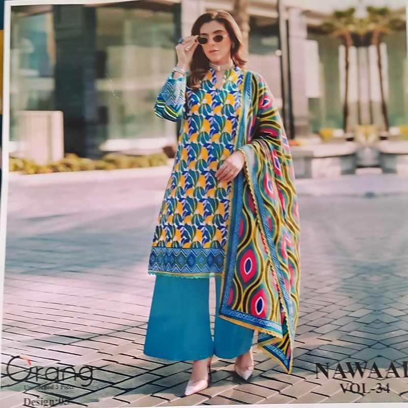 Brighten up your summer days with this vibrant and playful 3-piece unstitched suit from the Orang Nawaal Vol: 34 Summer Collection.