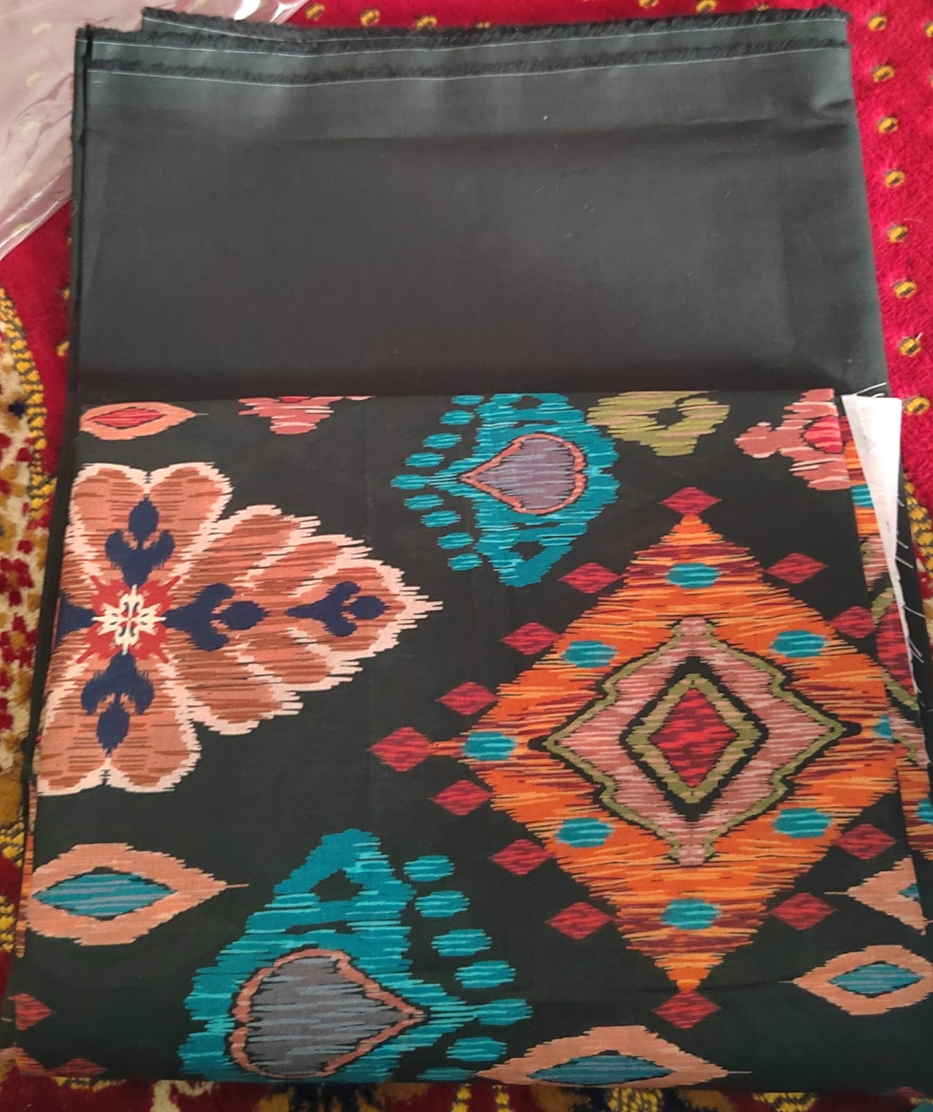 This eye-catching outfit features a deep black base adorned with a vibrant, intricate geometric print in striking shades of red, teal, and orange. The shirt is crafted from breathable Digital Printed Plain Lawn, ensuring you stay cool and comfortable all day long. It comes with premium solid black dyed cotton trousers. Because the fabric is completely unstitched, you have the freedom to tailor it to your exact preferences—such as the trendy wide-leg palazzo style showcased by the model!