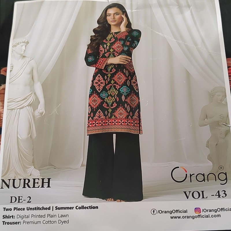 Make a sophisticated statement this season with this beautiful 2-piece unstitched suit from the Orang Nureh Vol: 43 Summer Collection.
