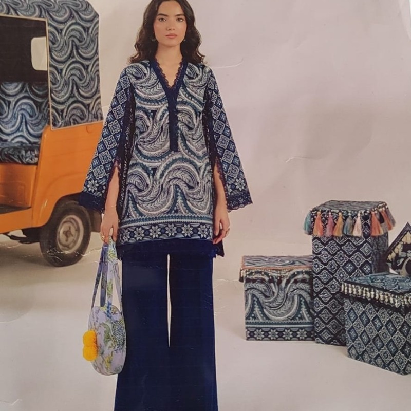 This stunning outfit features a cool, deep blue and white color palette. The shirt showcases an intricate, flowing pattern with beautifully detailed borders, crafted from lightweight Plain Lawn to keep you comfortable all day. It is paired with perfectly matched solid dark blue dyed cotton trousers. Because it is unstitched, you can design the outfit to perfectly suit your style—whether you prefer wide-leg trousers like the model or a classic tailored look.
