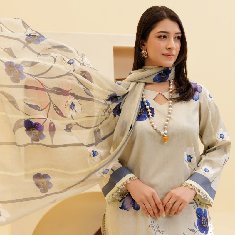 ECHOING THE REGAL CHARM OF VINTAGE TAPESTRIES, THIS BEIGE OUTFIT CARRIES A DIAMASKINSPIRED PRINT THAT WHISPERS OF OPULENCE. THE CONTRASTING PRINTED DURATIA ADDS DEPTH, PAINTING A PICTURE OF TIMELESS GRANDEUR